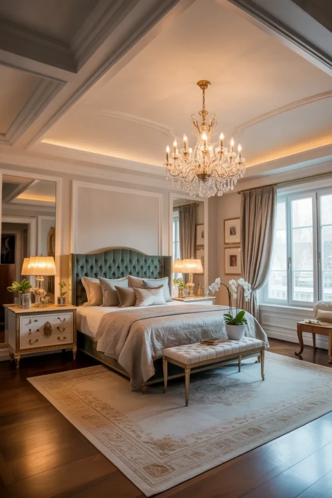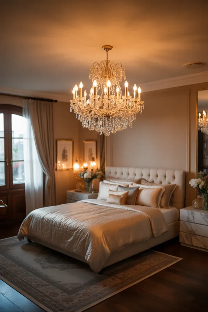 A statement chandelier introduces drama and sophistication to a master bedroom. Whether crystal, metallic, or sculptural in design, a chandelier draws the eye upward and adds a sense of grandeur. When paired with neutral tones and soft furnishings, it enhances elegance without overpowering the space.