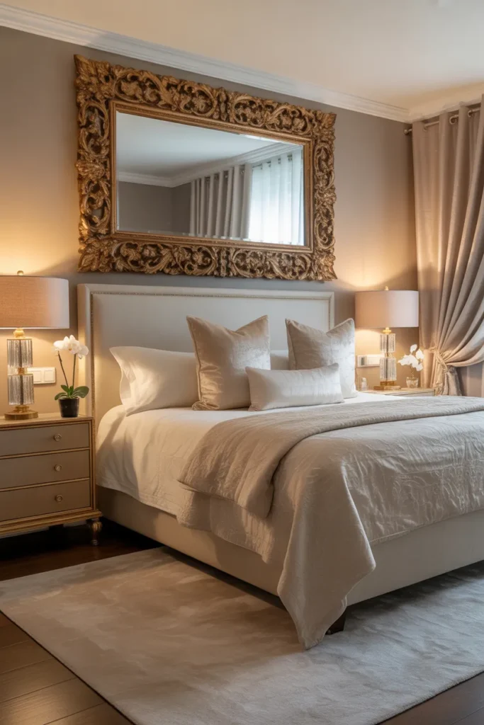 Mirrors are a powerful design element that adds brightness and openness to a master bedroom. When placed thoughtfully, they reflect natural and ambient light, making the room feel larger and more balanced. Framed mirrors in wood, metallic, or neutral finishes add sophistication while blending seamlessly with the overall décor.