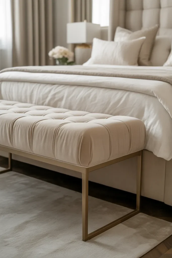 An upholstered bench at the foot of the bed adds both elegance and functionality. It provides a place to sit, lay out clothing, or style decorative throws. Neutral upholstery keeps the look cohesive and refined.