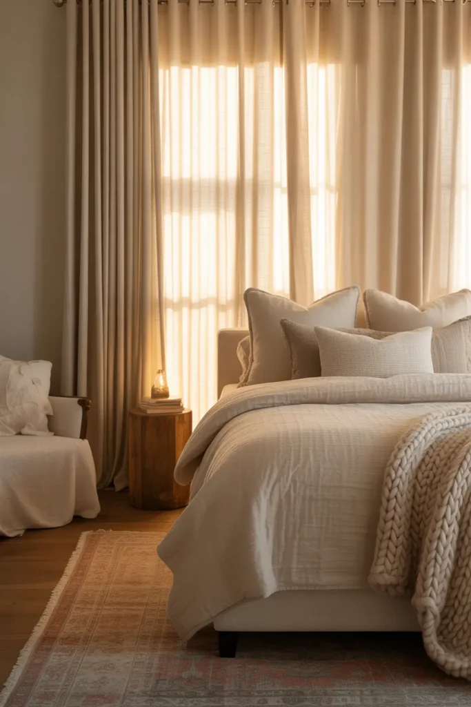 Beyond aesthetics, layered curtains improve insulation and help regulate temperature. They also soften acoustics, making the bedroom feel quieter and more restful. This design choice frames windows beautifully and adds vertical interest, contributing to a space that feels thoughtfully styled and luxuriously comfortable.