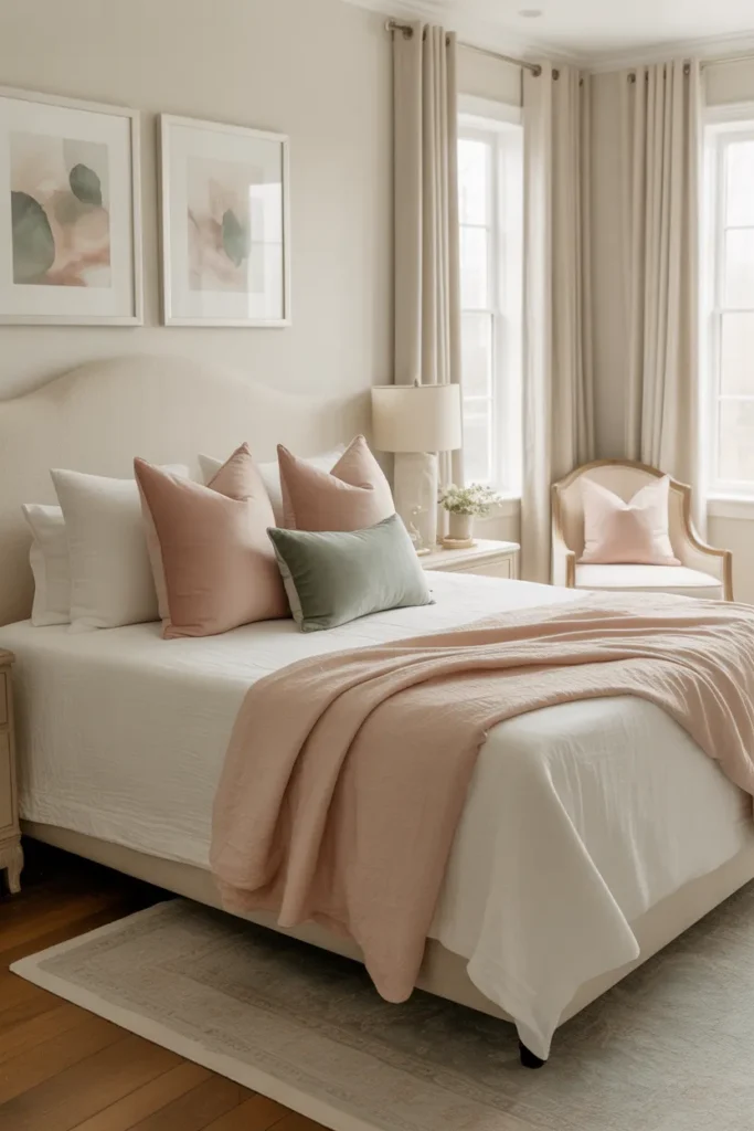 Soft color accents add personality to a master bedroom while maintaining a refined look. Muted tones such as sage, blush, or warm blue introduced through pillows, throws, or artwork create subtle contrast. These accents enhance visual interest without overwhelming the space.