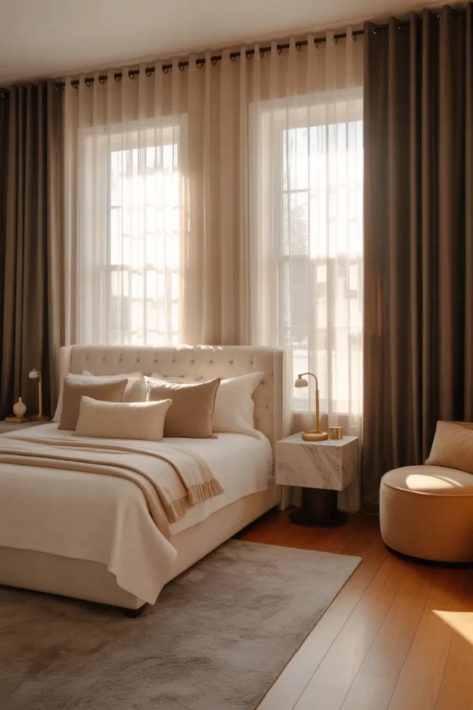 Layered window treatments add depth and elegance to a master bedroom while enhancing comfort. Combining sheer curtains with heavier drapes allows natural light to filter softly during the day and provides privacy at night. This layering creates a refined, hotel-inspired look that feels polished yet inviting. Neutral fabrics such as linen or velvet maintain a calm, cohesive appearance.