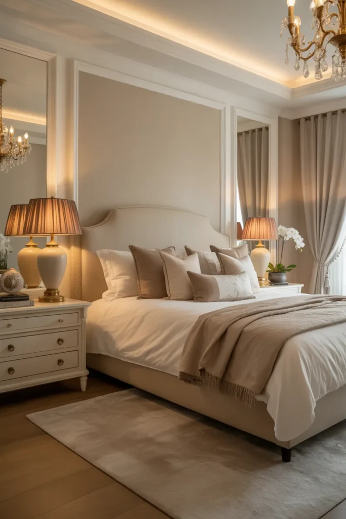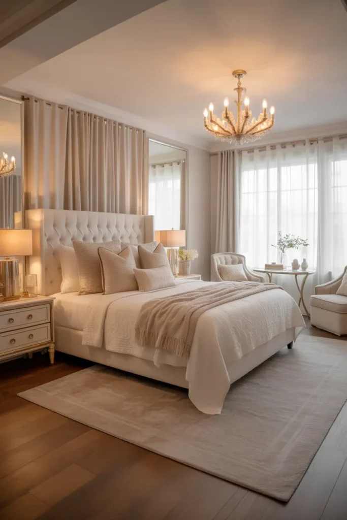 This lighting choice also elevates the overall design by adding personality and visual interest. Chandeliers work particularly well in rooms with higher ceilings, creating a refined, hotel-inspired feel. The result is a bedroom that feels luxurious, distinctive, and carefully curated.