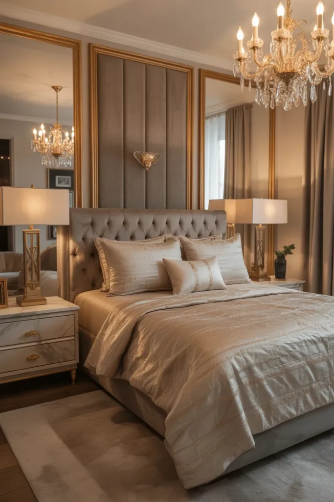 Mirrors also introduce depth and visual flow. They break up solid walls and enhance symmetry, especially when paired with dressers or seating areas. This simple addition elevates the bedroom’s elegance while serving a practical purpose, creating a space that feels airy, polished, and refined.
