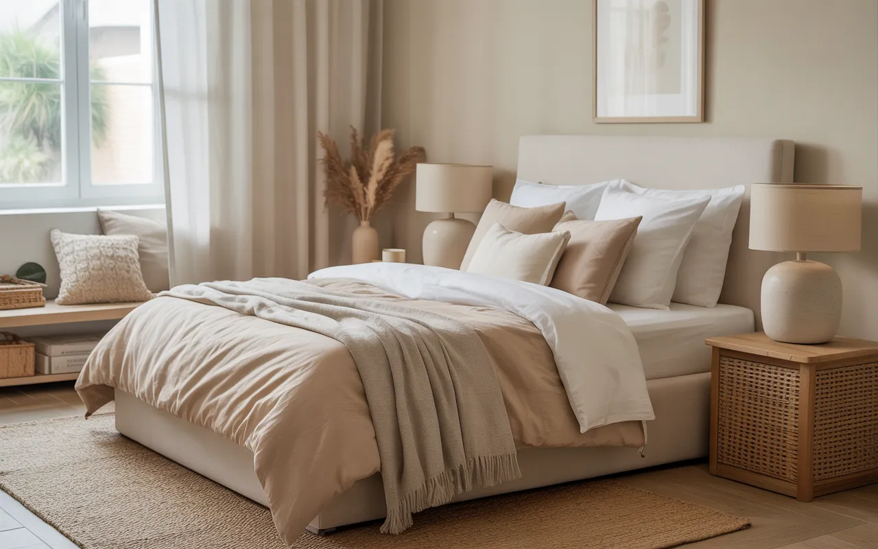 A soft neutral palette instantly makes a guest bedroom feel calm and welcoming the moment someone walks in. Shades like warm beige, cream, light taupe, and soft white help the space feel brighter and more open. Guests often arrive tired from travel, so a visually quiet environment helps them relax faster. In many homes I’ve seen, neutral tones also make smaller rooms appear larger and less cluttered. Pairing neutral bedding with subtle textures such as linen, cotton, or knitted throws adds depth without overwhelming the room. The overall effect feels hotel-like, simple, and comfortable for almost any visitor.