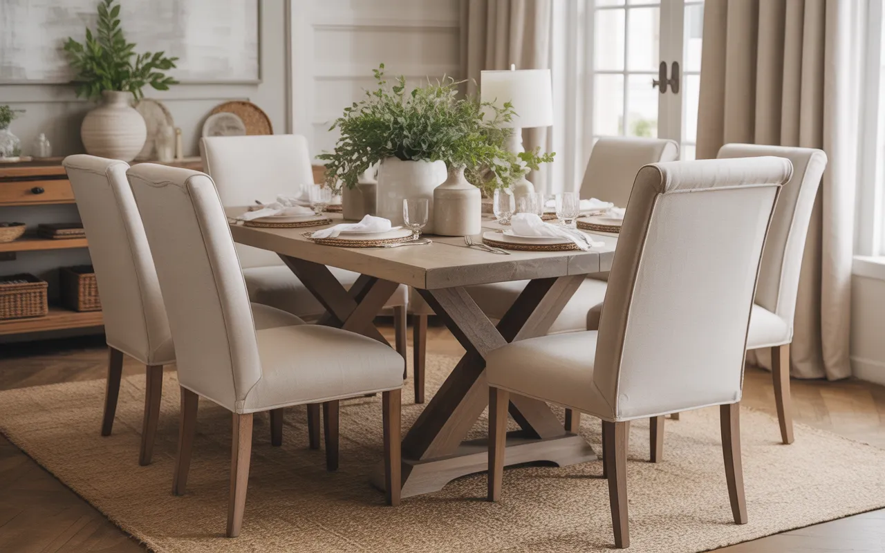 Beyond comfort, neutral chairs provide a versatile design foundation. I’ve seen how their understated color allows other farmhouse elements, like wooden tables, chandeliers, or rugs, to stand out. The fabric also introduces subtle texture, softening rigid lines and adding depth to the room. This combination of practicality and aesthetics makes the dining space both functional and visually appealing. Neutral upholstered chairs are a reliable choice for anyone seeking a balance of style, comfort, and Pinterest-friendly farmhouse charm that adapts to evolving decor preferences.