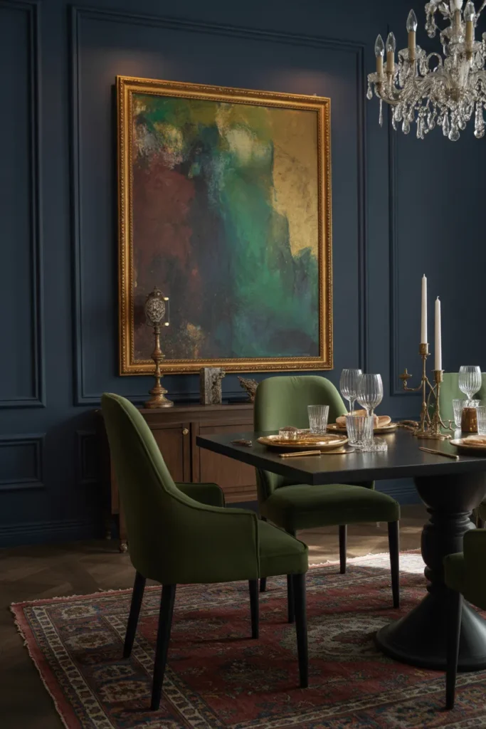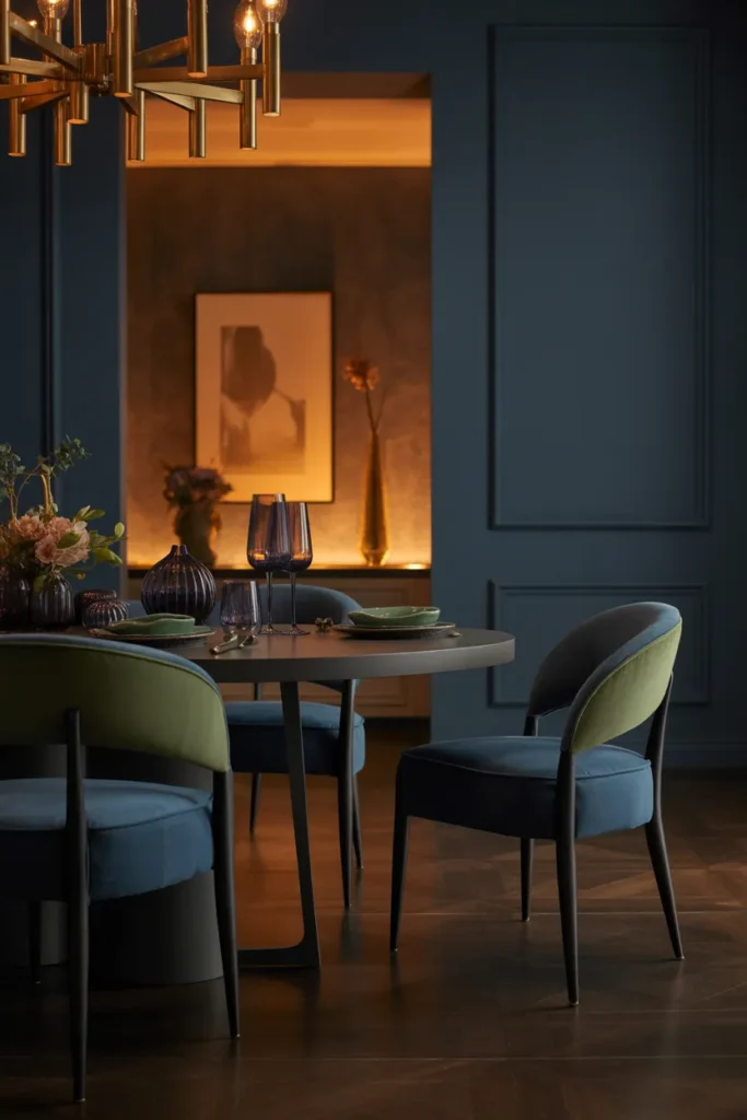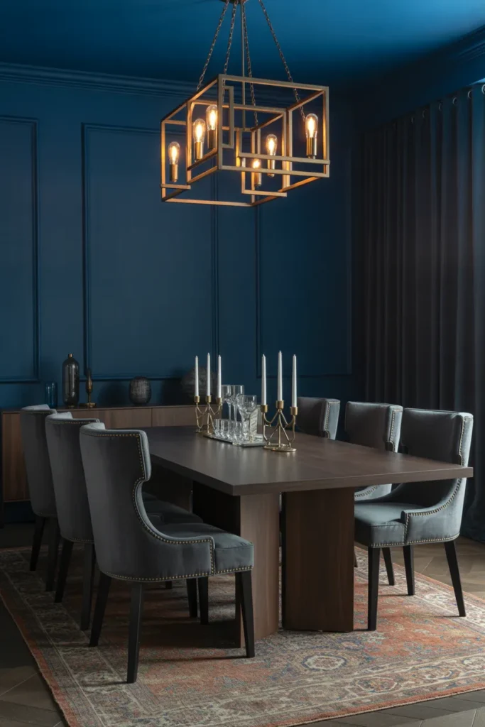 Dark blue walls offer a refined alternative to black, bringing calm sophistication to dining rooms. Navy and midnight blue tones feel deep and elegant without appearing harsh. When paired with warm lighting and wood furniture, the space feels balanced and welcoming. Metallic accents add subtle contrast and polish.