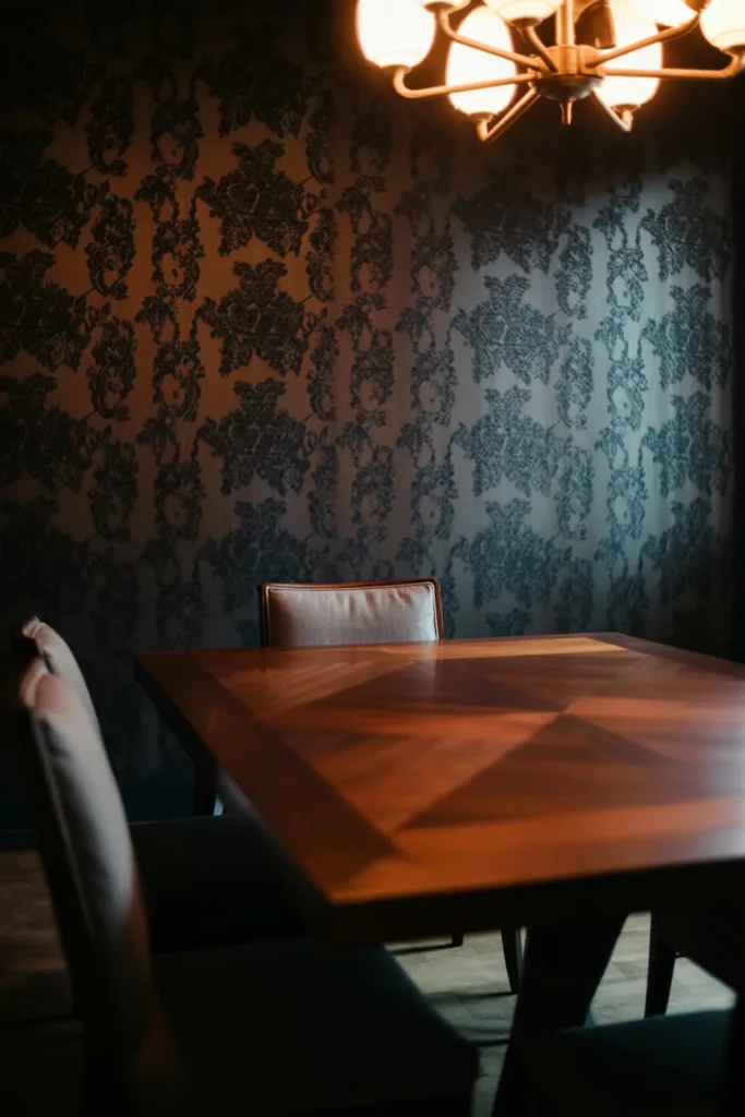 This style feels artistic and refined. Dark wallpaper works best when balanced with minimal décor and quality materials. The dining room becomes intimate, stylish, and thoughtfully designed, making every meal feel special and elevated.