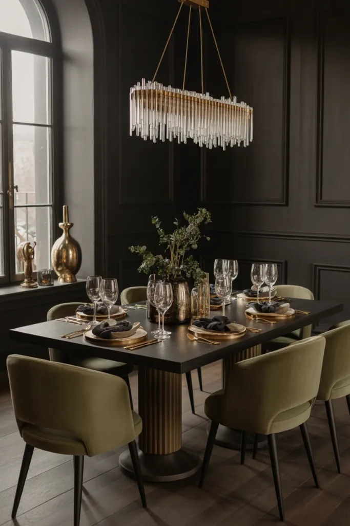 When used sparingly, gold accents elevate the room’s aesthetic. They pair especially well with black, charcoal, and deep green tones. The dining room feels polished, balanced, and luxurious, perfect for an elegant yet inviting atmosphere.