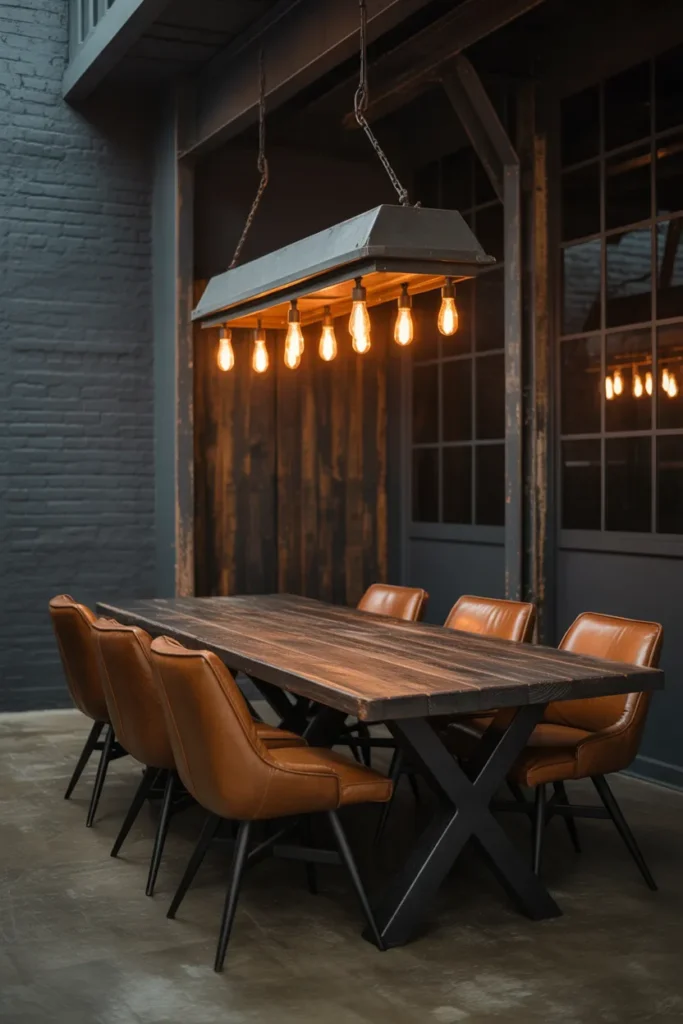 Industrial elements bring edge and character to moody dining rooms. Metal lighting, raw textures, and dark finishes create a bold, urban feel. When paired with warm lighting, industrial details feel balanced rather than harsh. Wood furniture softens the look, adding comfort and warmth.