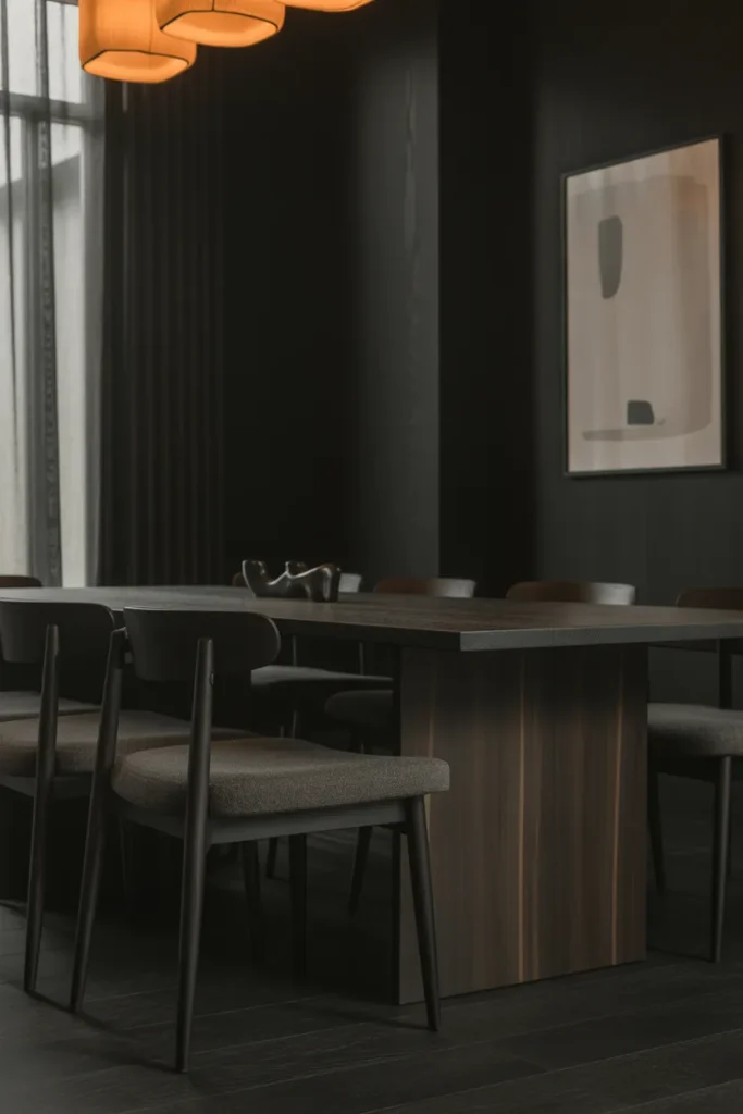 Minimal décor allows moody dining rooms to feel intentional and refined. Clean lines, simple furniture, and limited accessories keep the space visually calm. Dark walls and finishes become the main design features, enhanced by thoughtful lighting. The absence of clutter highlights texture, color, and form.