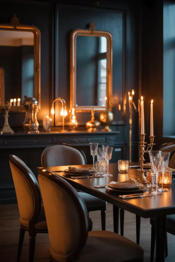 Mirror accents enhance depth and light in moody dining rooms. Reflective surfaces bounce light around the space, balancing darker tones without brightening the palette too much. Mirrors add elegance while making the room feel more open and layered.