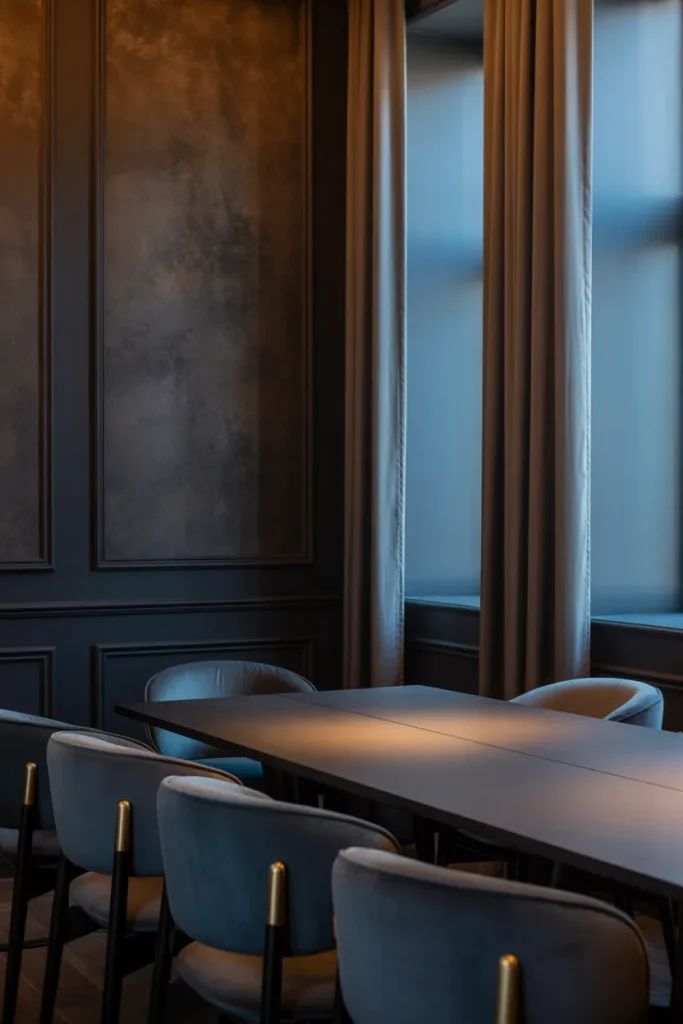 A deep charcoal dining room creates a strong sense of sophistication and depth. Dark walls instantly make the space feel intimate and refined, especially when paired with dark wood furniture. Charcoal tones add richness without overwhelming the room, allowing textures and finishes to stand out. Soft ambient lighting balances the darkness, creating warmth while highlighting architectural details and furniture shapes.