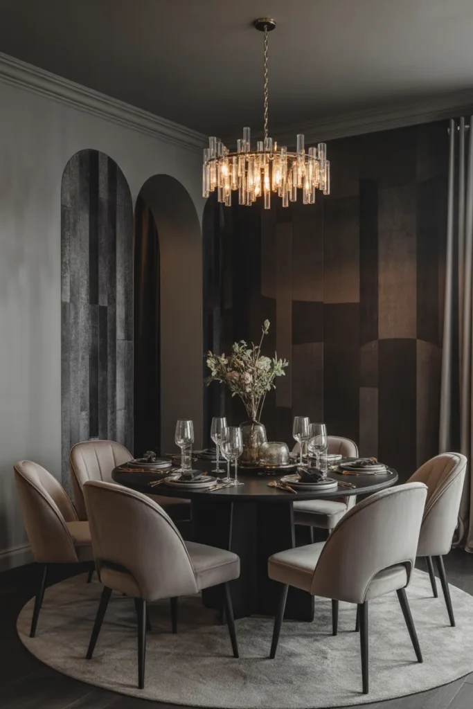 This style feels bold yet welcoming when designed thoughtfully. Charcoal works beautifully with both modern and classic elements. Warm lighting and subtle accents prevent the space from feeling heavy, resulting in a dining room that feels luxurious, timeless, and comfortable for everyday gatherings.