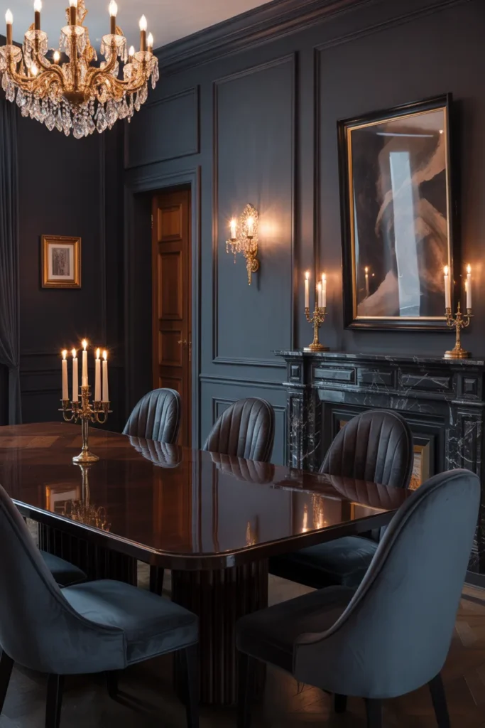 Candlelight creates an intimate and calming atmosphere in moody dining rooms. Soft, flickering light enhances dark tones, adding warmth and depth to the space. Candles bring a sense of romance and elegance, making meals feel more intentional and special. Simple table settings allow the gentle glow to remain the focal point.